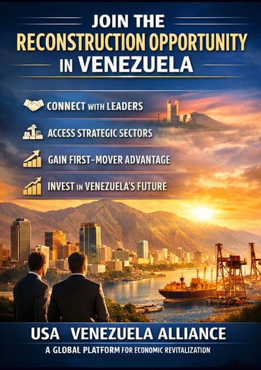 The USA Venezuela Alliance is a private-sector-led initiative designed to coordinate governments, international institutions, qualified investors, and affiliated companies to accelerate reconstruction projects in Venezuela under transparent, compliance-driven frameworks.