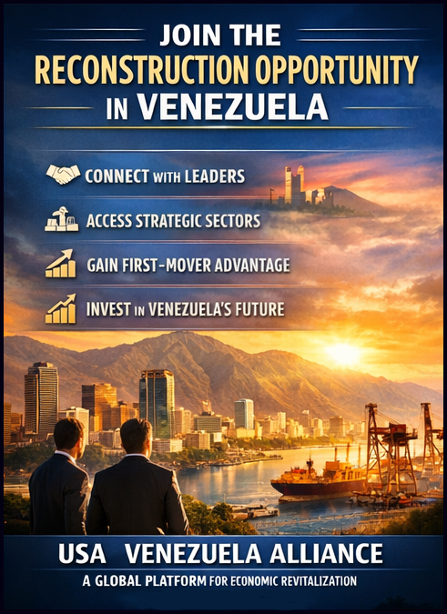 The USA-Venezuela Alliance will bring together leading international companies, institutions, and partners, presenting structured and transparent opportunities identified through our established networks in Venezuela, and aligned with priority reconstruction and development objectives, and calls upon: